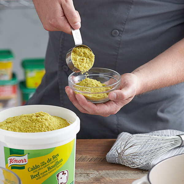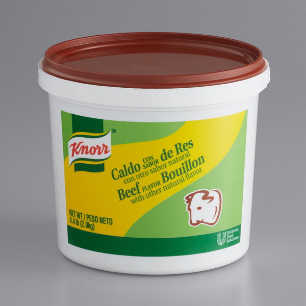 Whether making hearty soups or stews or discovering new ways to enrich and enhance the flavors of your dishes, this Knorr 4.4 lb. caldo de res / beef bouillon base is sure to become a staple in your kitchen. Featuring real beef flavor blended with parsley and spices, this base ensures a consistent flavor and is extremely versatile to use. Add this base to boiling water to create a hearty broth that can be used in various dishes, such as home-style beef broth noodle soup, or use to create a hearty beef stew to pour over mashed potatoes. You can even use a small amount of this base to rub on cuts of beef before roasting, or add to sauces to intensify the savory flavor.